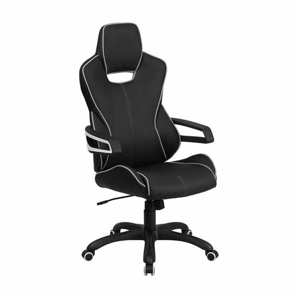 Tilt lock mechanism Contemporary office chair Tilt tension adjustment knob Wrap around arms Heavy duty black nylon base with end caps; dual wheel casters Waterfall seat promotes healthy blood flow Swivel seat Pneumatic seat height adjustment Built-in lumbar support Black vinyl upholstery High back design with headrest Contemporary office chair Contrasting white trim